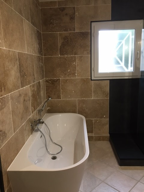 Très bonne réalisation de la salle de bain avec baignoire douche WC double vasques carrelage peinture. Techniciens très performants et aimables. Bravo !!!